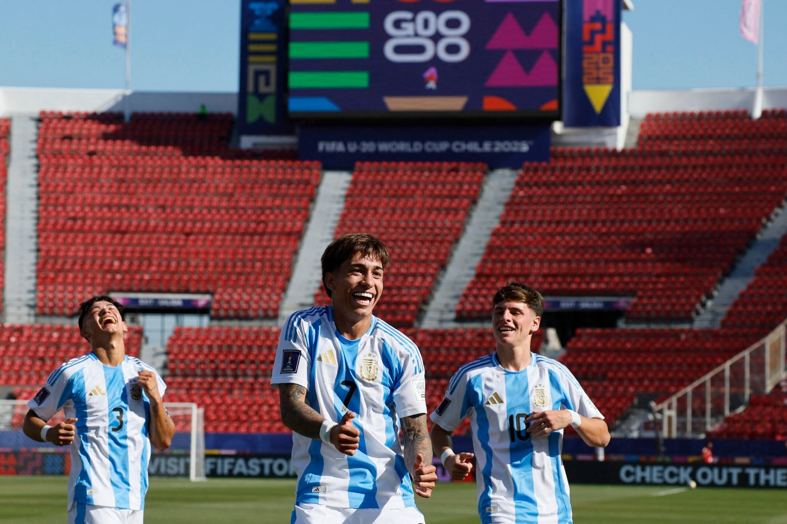 Futbol, Argentina vs Nigeria. Mundial sub 20, Chile 2025. El jugador de Argentina Maher Carrizo, centro, celebra con sus companeros tras marcar un gol contra Nigeria durante un partido de eliminacion directa de los octavos de final del mundial sub 20 realizado en el estadio Nacional de Santiago, Chile. 08/10/2025 Andres Pina/Photosport Football, Argentina vs Nigeria. U-20 World Cup Championship. Argentina’s player Maher Carrizo, center, celebrates with teammates after scoring against Nigeria during a U-20 World Cup, round of 16 knock out match, at the Nacional stadium in Santiago, Chile. 08/10/2025 Andres Pina/Photosport (Photo by ANDRES PINA/PHOTOSPORT / Photosport via AFP)