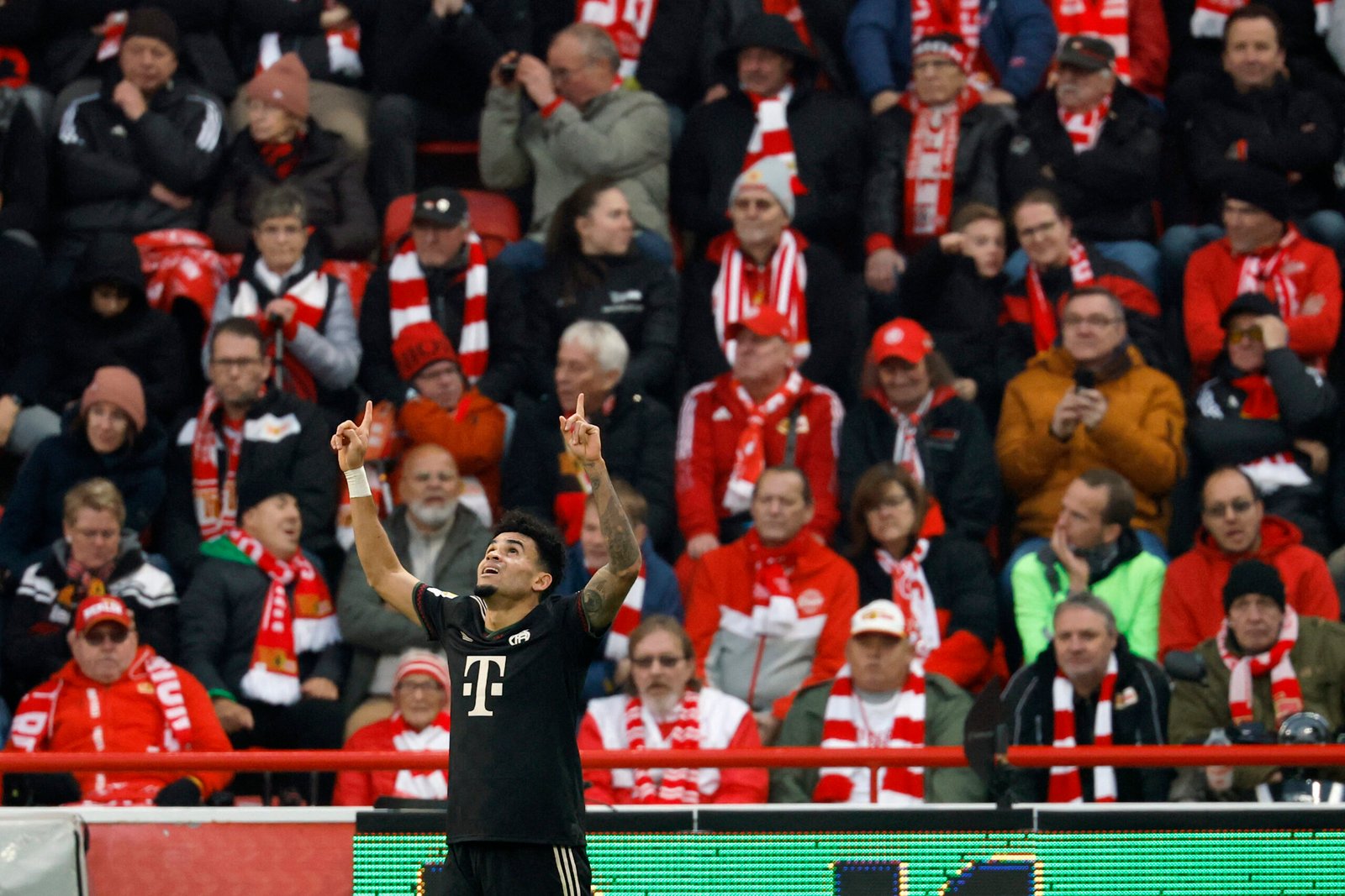 Bayern Munich's Colombian forward #14 Luis Diaz celebrates scoring his team's first goal in front of Union Berlin fans during the German first division Bundesliga football match between 1 FC Union Berlin and FC Bayern Munich in Berlin on November 8, 2025. (Photo by Odd ANDERSEN / AFP) / DFL REGULATIONS PROHIBIT ANY USE OF PHOTOGRAPHS AS IMAGE SEQUENCES AND/OR QUASI-VIDEO