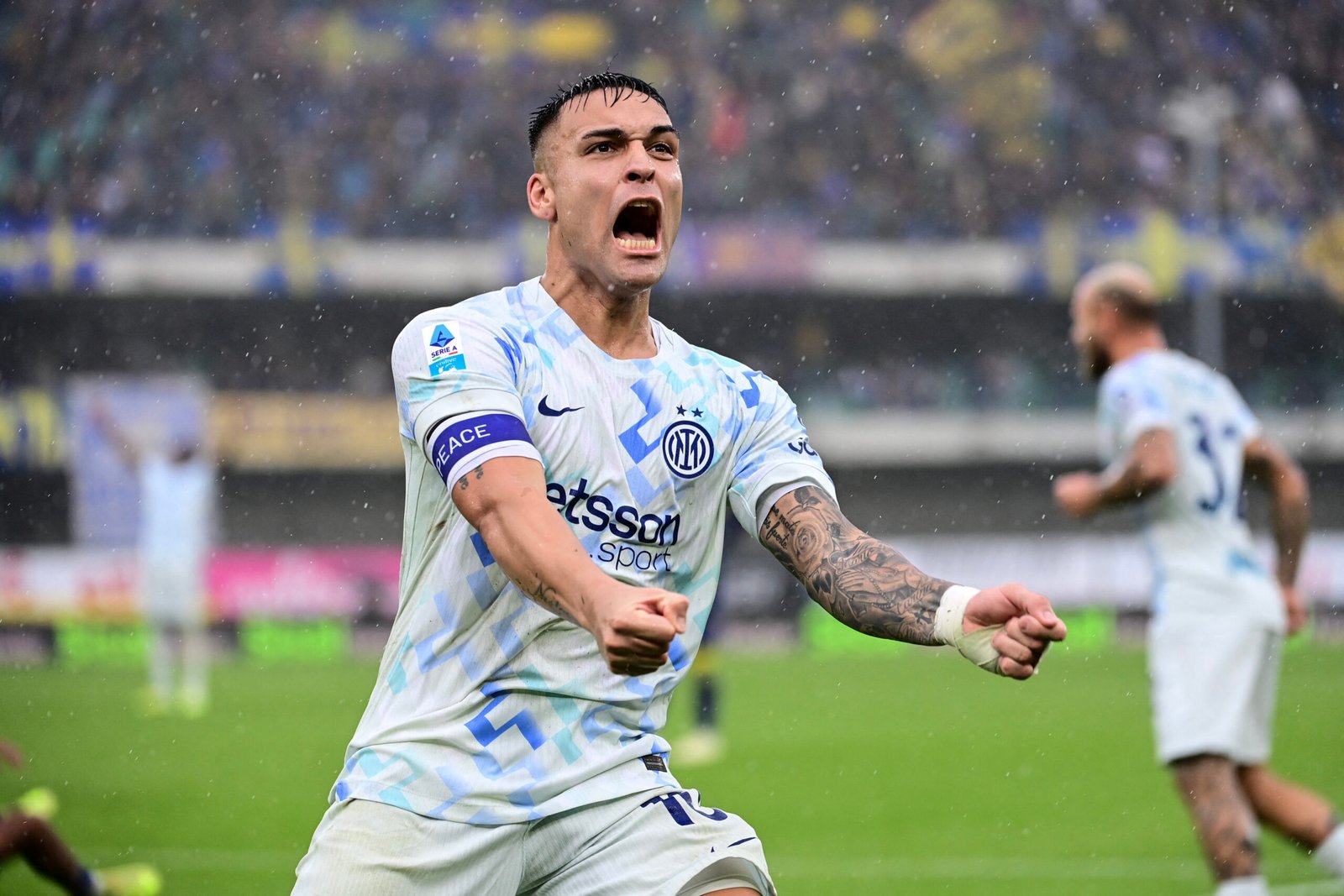 Inter Milan's Argentinian forward #10 Lautaro Martinez celebrates after an own goal by Hellas Verona's Danish defender #03 Martin Frese during the Italian Serie A football match between Hellas Verona and Inter Milan at the Bentegodi Stadium in Verona, on November 2, 2025. (Photo by Piero CRUCIATTI / AFP)