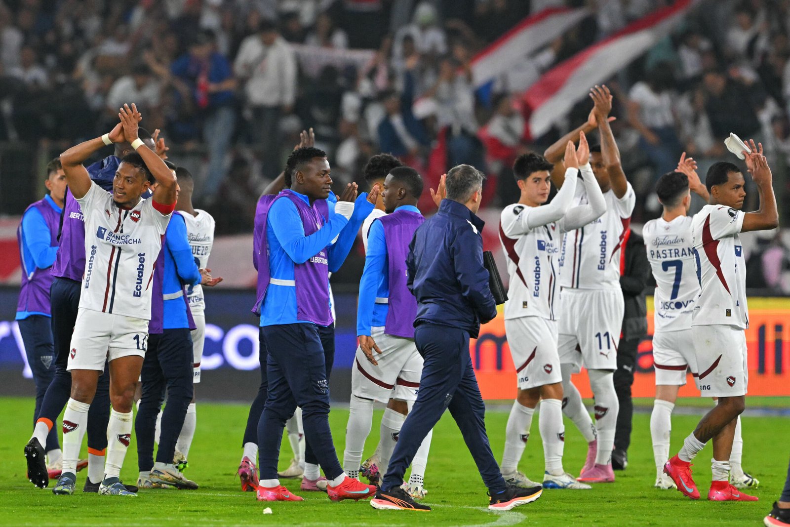 Players of Liga de Quito celebrate after winning the Copa Libertadores semifinal first leg football match between Ecuador's Liga de Quito and Brazil's Palmeiras at the Rodrigo Paz Delgado stadium in Quito on October 23, 2025. (Photo by Rodrigo BUENDIA / AFP)