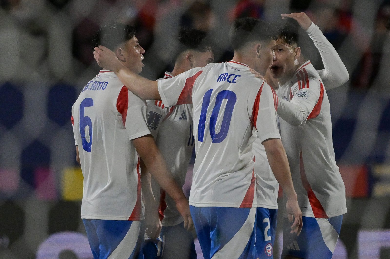 Chile's midfielder #06 Javier Carcamo (L) celebrates scoring his team's first goal with teammates during the 2025 FIFA U-20 World Cup football match between Egypt and Chile at the National Stadium in Santiago on October 3, 2025. (Photo by Rodrigo ARANGUA / AFP)