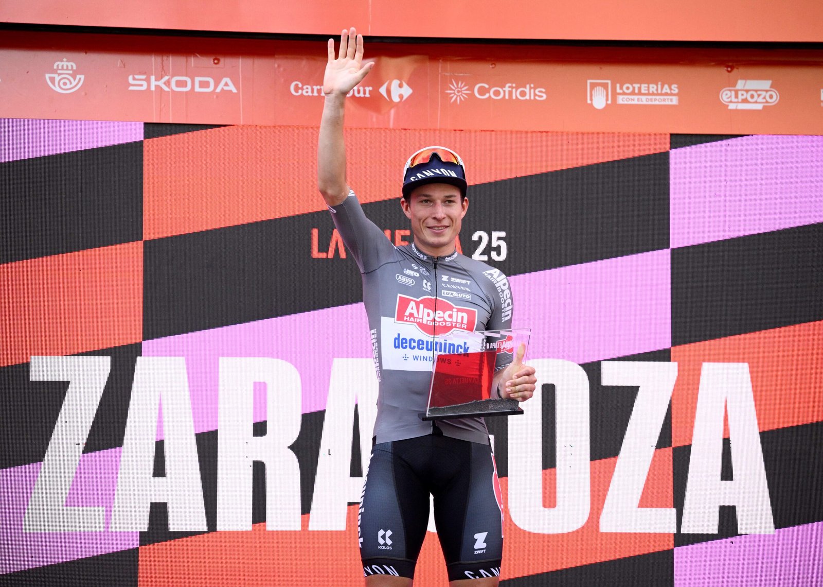 Team Alpecin's Belgian rider Jasper Philipsen celebrates on the podium after winning the eighth stage of the Vuelta a Espana, a 158 km race between Monzon Templario and Zaragoza, on August 30, 2025. (Photo by Josep LAGO / AFP)