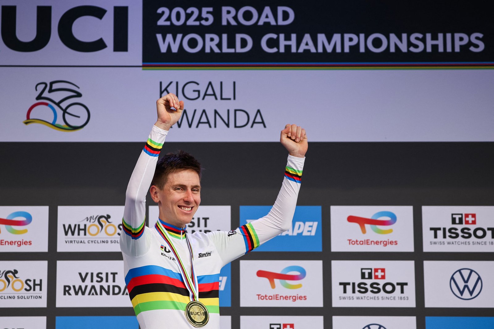 El ciclista Tadej Pogacar aumentó su palmarés este domingo tras defender el título de campeón del mundo, con un ataque a 104 km para la meta durante los Mundiales de Ciclismo en Kigali, los primeros disputados en África.